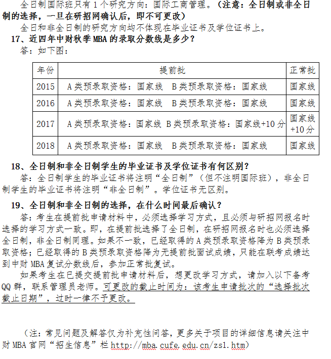 4、關于學習方式:全日制和非全日制的選擇:考生在提前批申請材料中,必須選擇學習方式,且必須與通過中國研究生招生信息網(簡稱研招網,教育部指定網站)報名時(一般在10月)選擇的學習方式一致。即,在提前批選擇了全日制,在研招網報名時也必須選擇全日制,非全日制同理。如果不一致,已經取得的A類預錄取資格降為B類預錄取資格;已經取得的B類預錄取資格降為無提前批面試成績,只能在聯考成績達到中財MBA復試分數線后,參加正常批復試。