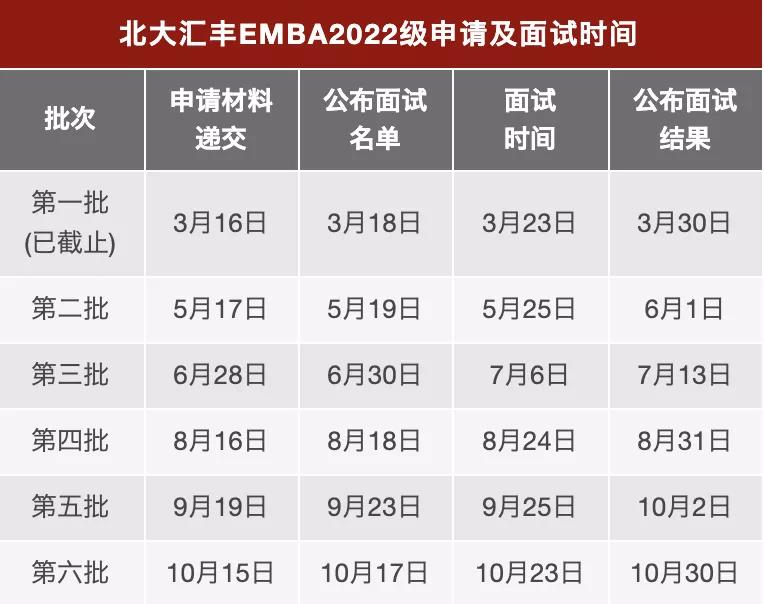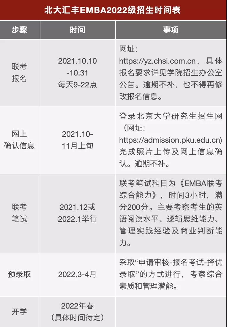 以上就是“2022EMBA招生簡章:北京大學匯豐商學院2022年高級工商管理碩士(EMBA)招生簡章”的內容了,更多考研信息,請持續關注,預祝大家考研成功!