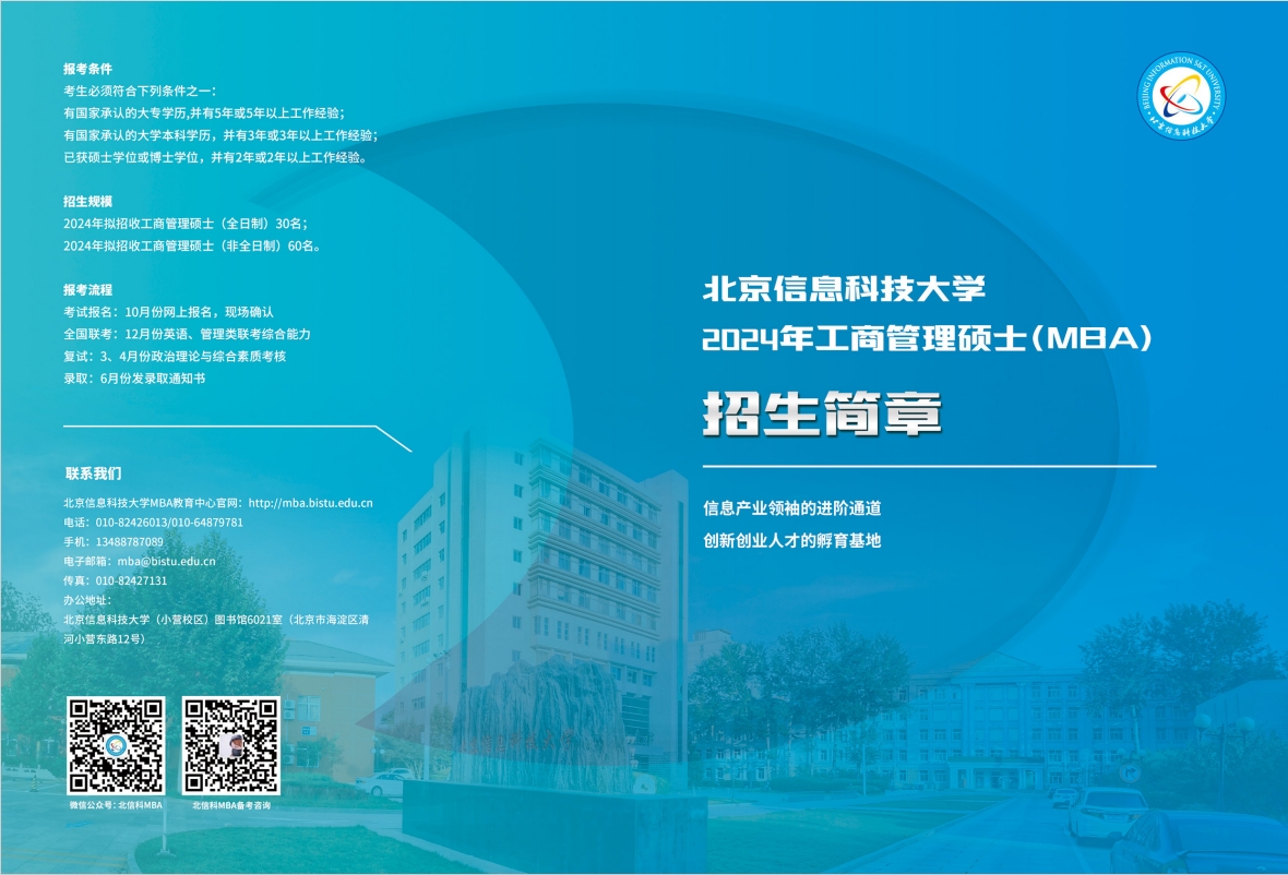 導讀:招生簡章是每年考研er需要關注的重要官方政策,一般情況下涵蓋了各個專業的報考條件、招生名額、學費、學制、報考流程等必要信息,為了幫助大家及時掌握一手信息,迅速做出報考應對,小編今天為大家帶來了“2024MBA招生簡章:北京信息科技大學2024年工商管理碩士(MBA)招生簡章”,一起關注一下吧!